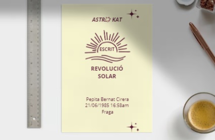 Descobreix com aprofitar al màxim les energies disponibles aquest any amb el nostre Escrit de Revolució Solar. Aquest document astrològic de 15 pàgines aproximadament t’ofereix una anàlisi arquetípica de la teva Revolució Solar, explicant-te de manera clara i senzilla com pots treure el màxim profit de les influències astrals específiques per a tu.